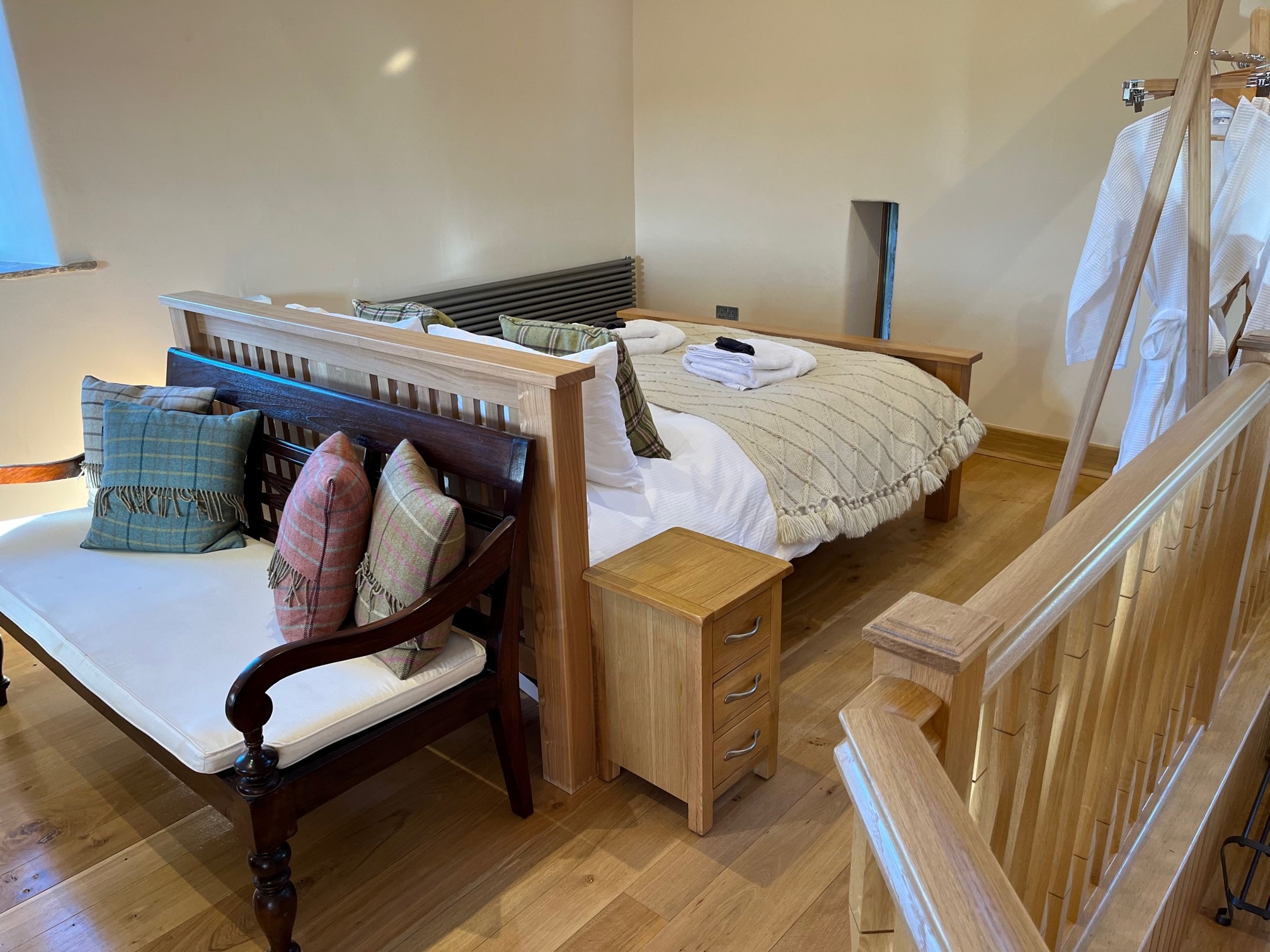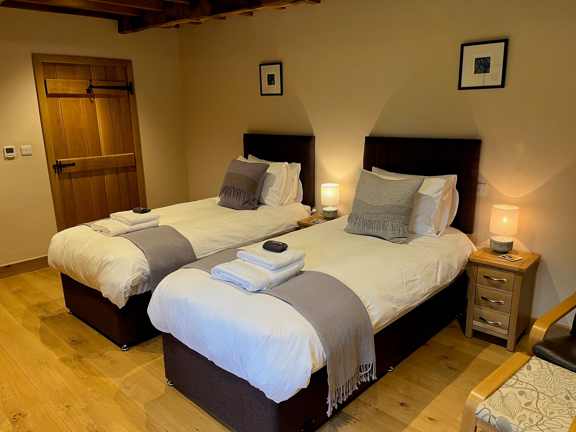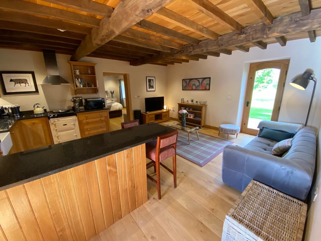 Superking bedroom in The Barn, overlooking the patio and grounds